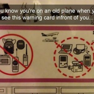 People used to bring typewriters, video cameras, Gameboys, and walkmans on planes before smart gadgets were introduced. This appears to be one of the older flights that have not yet updated their signs. The caution warns against using outmoded battery-powered products that are no longer widely used.