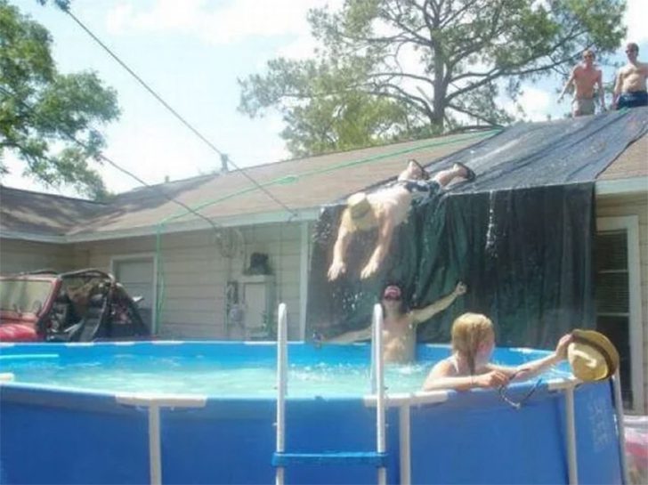 Uns fallen mindestens zehn verschiedene Dinge ein, das Gute daran ist, dass dich alle ins Fernsehen bringen könnten. Wenn Erwachsene eine Poolparty schmeißen, ist nich unbedingt davon auszugehen, dass welche vom Dach rutschen. Aber bei dieser Party, beschloss ein Typ, genau das zu tun.