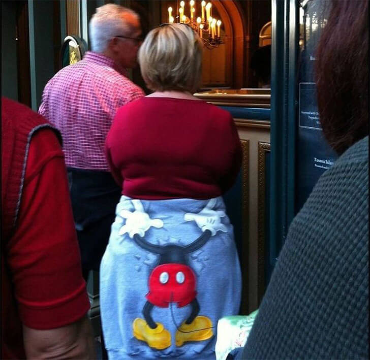 Then again, we think this lady had no idea that she did such a cringe-worthy thing by tying her hoodie around her waist. Also, that style went out the window decades ago. On top of that, why on earth did she even choose this Mickey hoodie as a church attire?