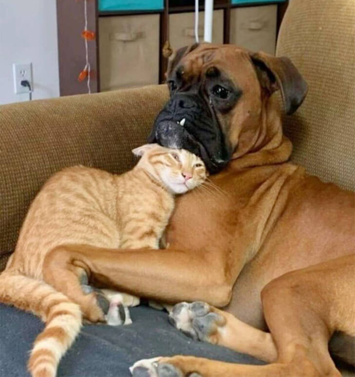 That may be hard to believe, but this photograph can prove it. Despite being good family dogs, Boxers are not the most desirable-looking and welcoming breeds. However, this boxer seems to have built a great relationship with the family’s cat, so much so that they’re cuddling and comforting each other during a crisis.
