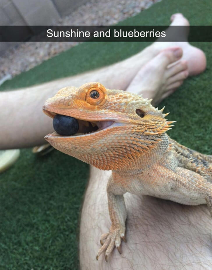 Take, for instance, bearded dragons, also referred to as pogona, a magnificent reptile of bright color. Despite not looking like the friendliest of beings, bearded dragons are great pets, even for kids, as they are delicate and obedient, according to Reptile Direct. They usually eat mealworms and crickets, but clearly, the one pictured here is enjoying a yummy blueberry on its master’s lap on a nice summer day.