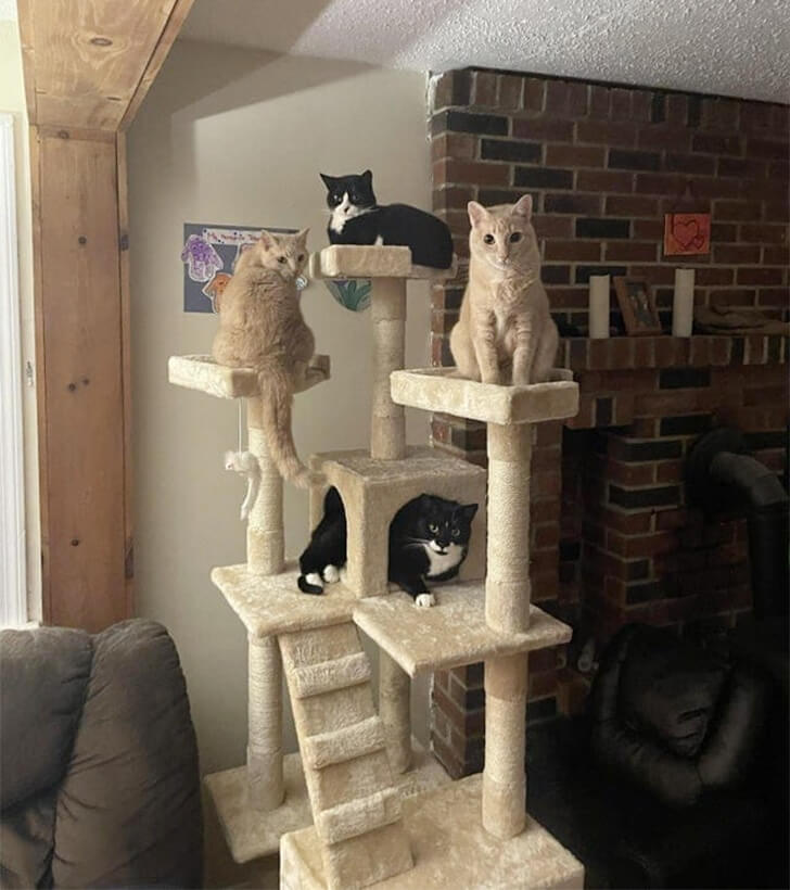 Pets don’t typically cooperate when taking photos. The chances of them staying still and looking at the camera are slim, which is why this click is one of a kind. Intentionally or not, these cats posed distinctively from one another at different levels of the tower while looking straight into the lens. The final product looks majestic!