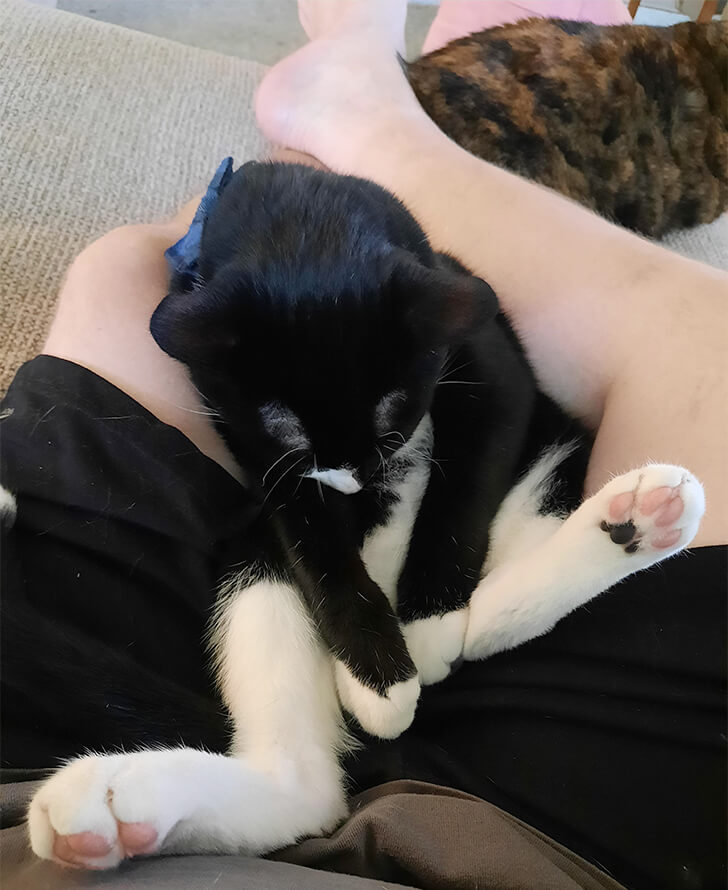 Can you guess who is actually in the uncomfortable position? It’s the owner. He is stuck with sitting right where he is for however long this kitten decides to sleep. Like a sleeping baby, the last thing you want to do is wake up a sleeping cat.