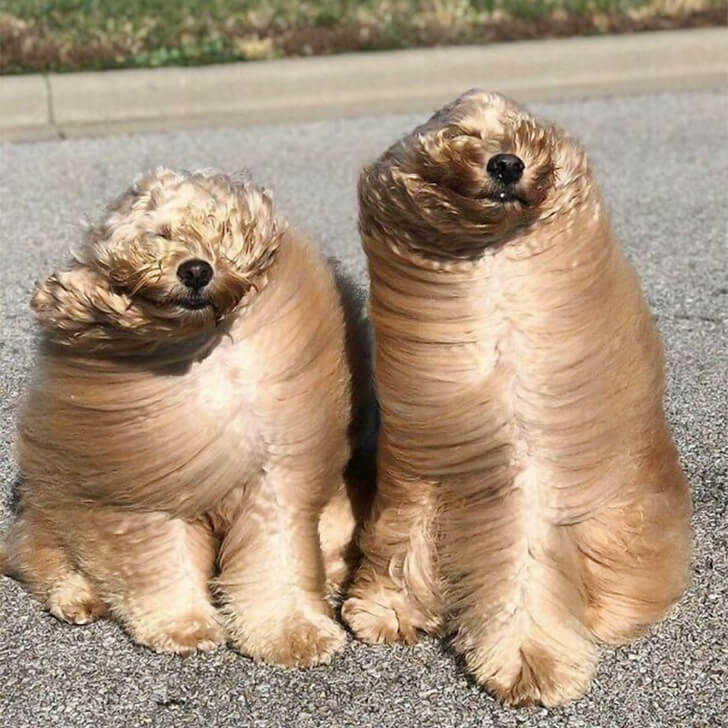 Almost every woman yearns for the kind of long, shiny, and healthy hair these two dogs have. But, of course, it’s the animals who couldn’t care less about their appearance that get the best of everything. The heavy winds make it challenging to deduce what breed these dogs are.
