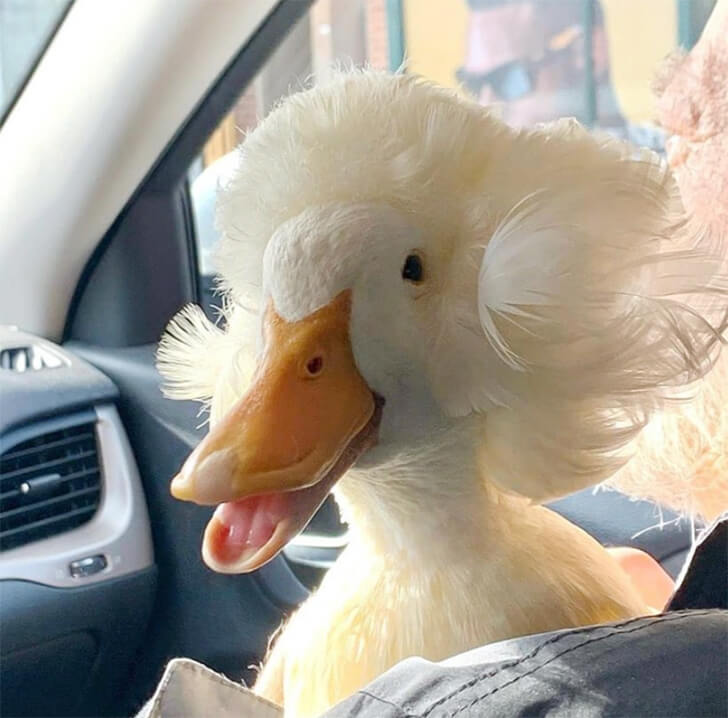 Since this magnificent bird has that fluffed-out messy combover, it looks like an animal from back in the day. Perhaps one from the same era as Presley. In today’s context, we’d most likely see a duck like this playing a grandfather duck on a kids’ cartoon. Either way, this is one very fancy duck, a White Pekin, to be more precise.
