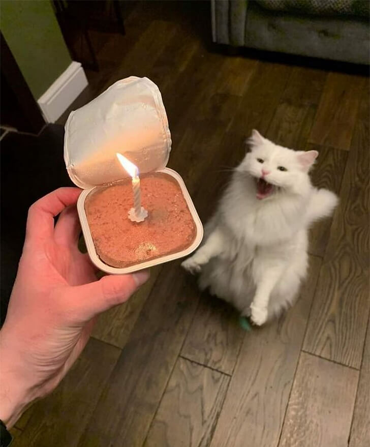 But for the sake of this jolly occasion (judging by the lit candle), we’re going to go with birthday excitement. To be that thrilled about its birthday, the feline must have witnessed a birthday before. Perhaps there are other older cats in the house, or he has watched his humans throw parties for their birthdays.