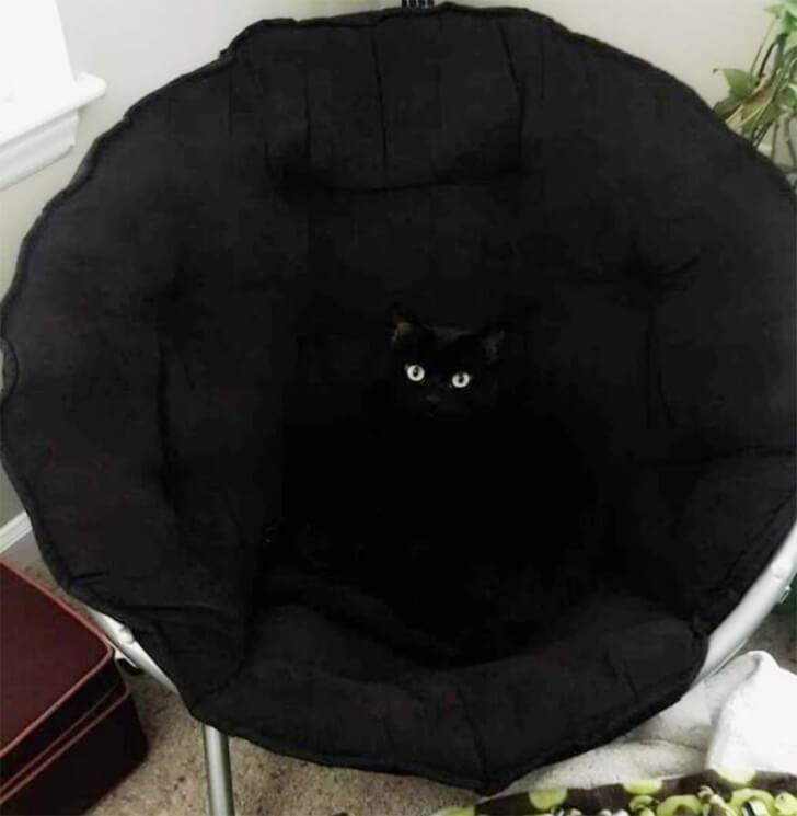 After all, it’s not like a history of black cat owners mysteriously dying or suddenly facing downfalls in life. We guess the worst that could happen by owning a full black cat is humans either accidentally sitting or stepping on them. Why? Because their darkness camouflages into anything with a pure black background, making it almost impossible to spot them. This picture is the perfect example.