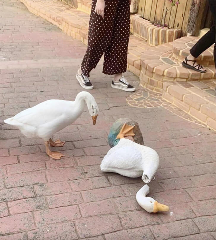 We’re guessing it didn’t realize it was a statue until it got closer. We feel sorry for the poor guy who looks heartbroken about his fellow brother with a severed neck. As per Fao.org, geese are very intelligent birds. So while he may be sad, he’ll also quickly figure out that it isn’t a real goose.
