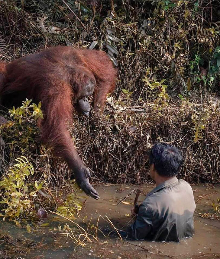 Regardless, given their love for mimicry, it might just mock the human once he’s out of the water. Who knows if that’s the reason behind the man’s reluctance to accept help? The truth is, he is a geologist in Indonesia who is in the water to get rid of venomous reptiles that bite primates. So, in reality, the human is actually helping out the ape.