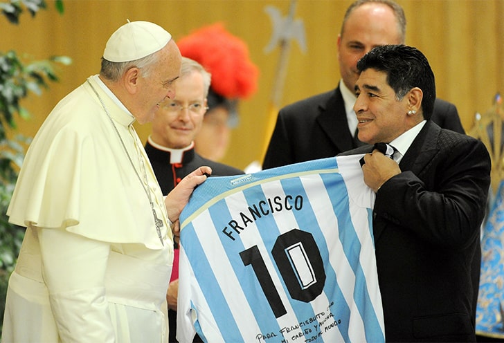 Diego Armando Maradona aveva un buonissimo rapporto con Papa Francesco, suo connazionale. Quando Bergoglio venne eletto e riuscì ad incontrare Bergoglio be due anni dopo la sua elezione a Pontefice. Fu una grande mozione ed un onore per Diego, che si commosse di fronte a questi incontro epocale. Il Papa stesso di fronte alla morte di Diego lo ha voluto ricordare nelle sue preghiere.