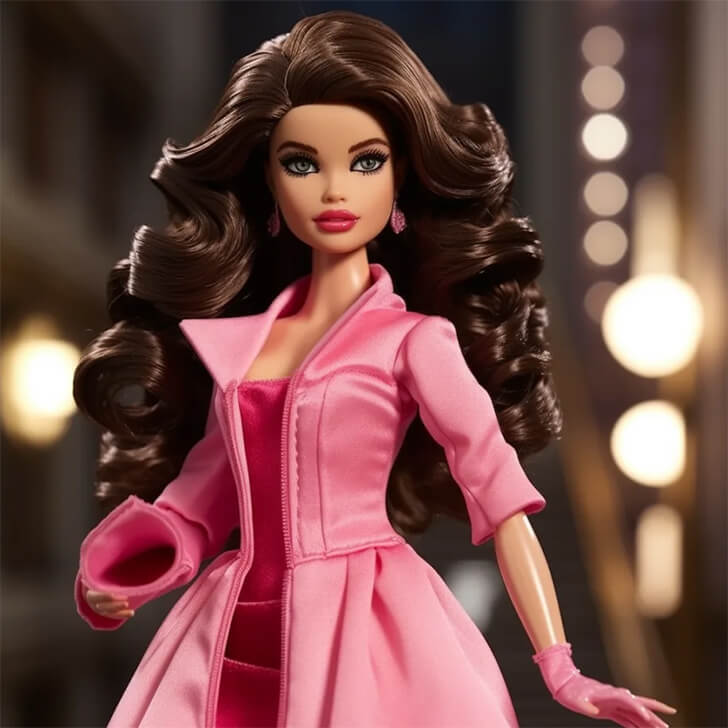 In a striking showcase of computerized creativity, Selena Gomez is portrayed in all her grace and style. The multi-talented artist, celebrated for her music and acting, is adorned in shades of pink like a true Barbie, complemented by matching earrings and gloves. As she strikes a captivating pose, her brunette hair, wavy and full, cascades down from her shoulders to her waist.