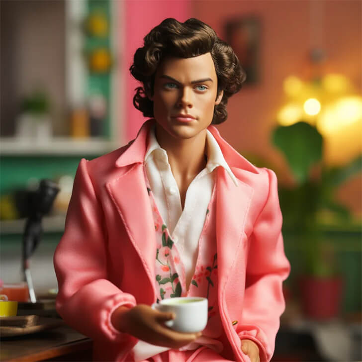 Behold the fascinating transformation of Harry Styles into a Ken doll, courtesy of artificial intelligence. The former One Direction member, acclaimed solo artist, and fashion icon is depicted in a pink jacket layered over a flowery vest and white shirt, highlighting his eclectic style.