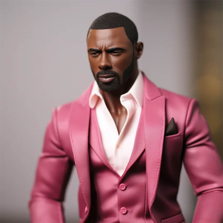 Idris Elba, known for his magnetic performances in “Luther” and “The Wire,” gets a playful makeover as a Ken doll. Donning a pink vest and jacket layered over a white undershirt, he manages to make even doll fashion look incredibly suave. His stern expression is classic Idris, while his short dark hair and beard lend an air of rugged sophistication.