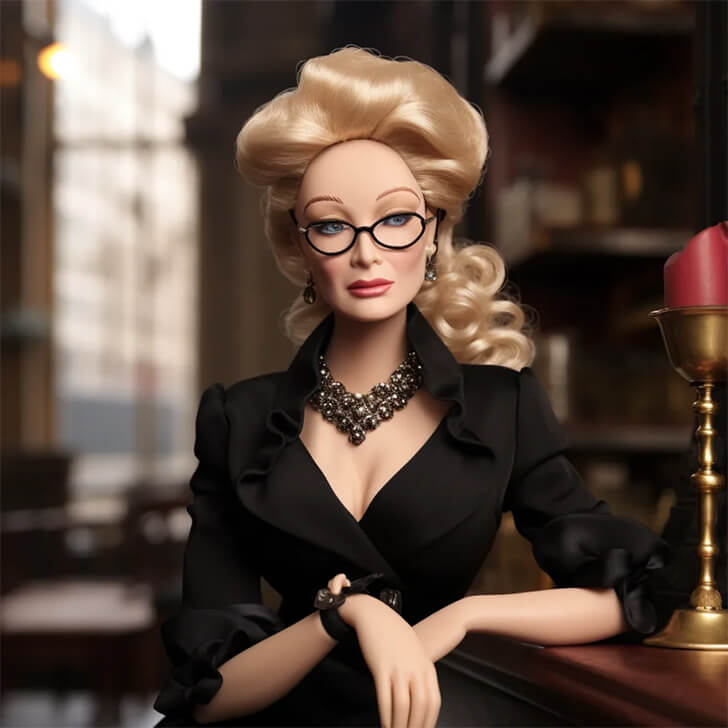 Meryl Streep, the legendary actress with a record 21 Academy Award nominations, is unsurprisingly reimagined as a doll with grace and sophistication. Dressed in a black gown with ruffled sleeves, she is adorned with a beautiful necklace and black-rimmed glasses, adding a touch of intellectual chic.