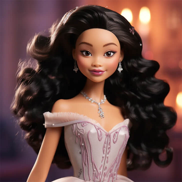 The essence of Lana Condor is beautifully captured in this splendid creation. With a cascade of full, luxurious waves, the doll’s hair is a masterpiece in its own right, enhancing the overall allure. The elegant off-shoulder gown, adorned with intricate embroidery on the bodice, exudes a sense of refined sophistication, while the diamond earrings and matching necklace add a touch of sparkle.