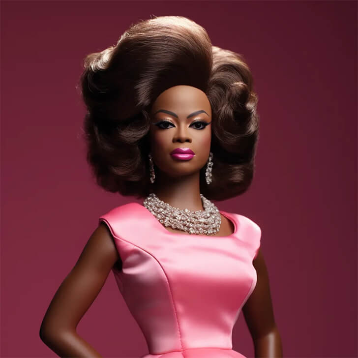 Here’s another striking display of technology and artistry. EGOT winner Viola Davis goes doll-sized, still embodying her defiant glare and posture. The doll’s radiant dark skin and full, puffy brunette hair are fitting. The award-winning actress, renowned for her powerful performances in projects like “Fences” and “How to Get Away with Murder,” is depicted wearing a pink dress, sparkling diamond earrings, and necklaces.
