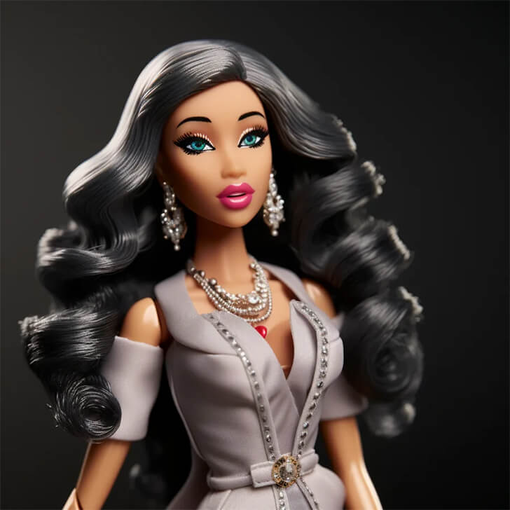 Another remarkable fusion of artificial intelligence and pop culture sees Cardi B transformed into a Barbie! The rapper and actress, known for her bold fashion choices and chart-topping hits, has expectedly ditched pink for a spectacular gray gown with a unique design. Accentuating her attire are layered necklaces, with a ruby pendant peeking through, and matching drop earrings.