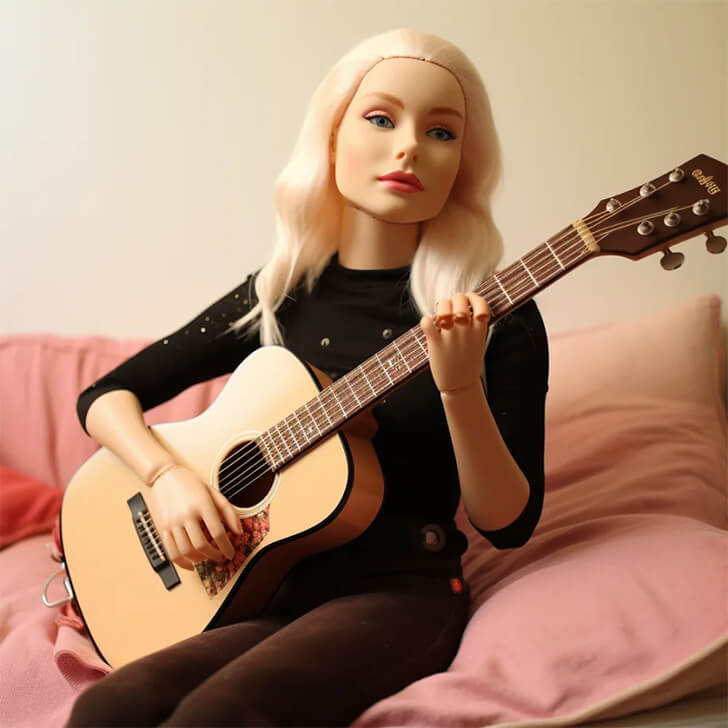 Indie music sensation Phoebe Bridgers has a new look as a Barbie, casually strumming a guitar on a pink bed. Sporting her typical laid-back style, the doll wears a black sweatshirt paired with brown pants and sports Phoebe’s straight blonde locks. The singer-songwriter, known for her heartfelt lyrics and haunting melodies, is celebrated in this charming rendition.
