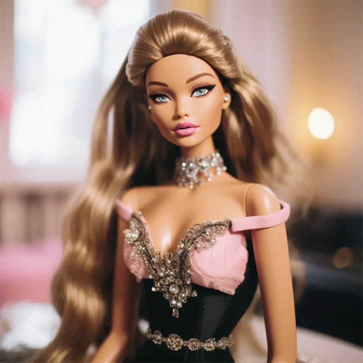 Gigi Hadid, the international supermodel known for conquering catwalks worldwide, has been stunningly recreated in Barbie form. Although the resemblance isn’t perfect, there’s an undeniable likeness that showcases her glam. The doll is adorned in a striking pink and black gown, highlighting a daringly embellished neckline that plunges into a cascade of stones.