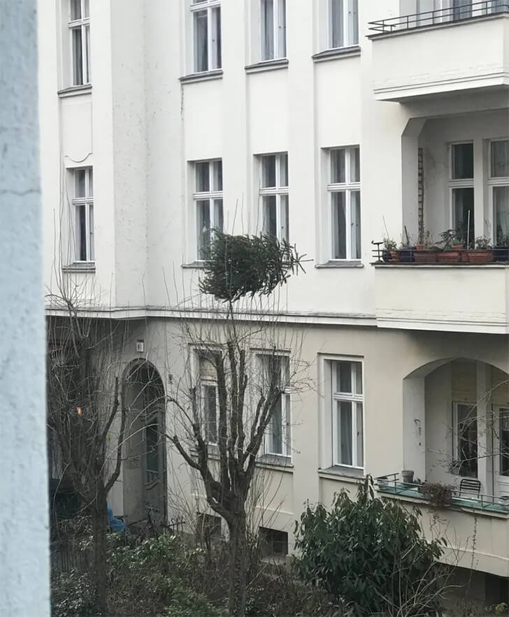 Judging by this picture, someone on the upper floors decided to get rid of the Christmas tree by throwing it on the street! It was captured by the branches of another tree, and it will most certainly sit there until next Christmas like a sad emblem of people’s laziness.