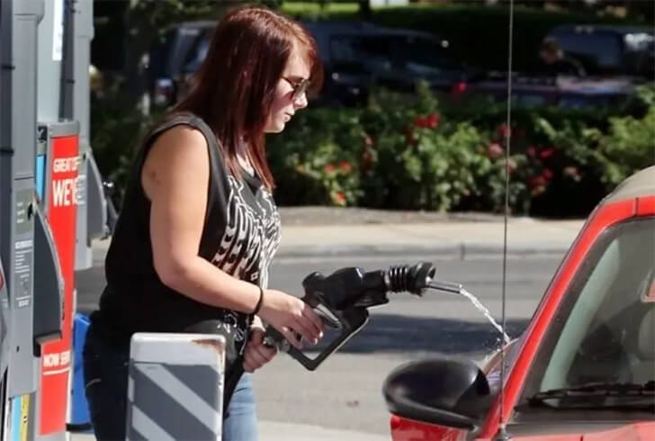 The woman in the picture is risking her life and the lives of others by filling her tank in the most unnatural way possible. How did this person even pass her driving test? This pumping-gas technique is not only wasteful but highly hazardous. If she does this every day, it’s a miracle she is still alive!