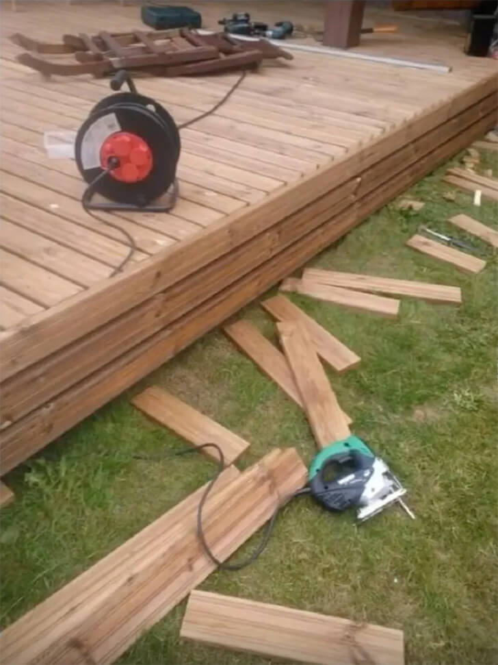 How will this person remove that electrical cord from there? We guess there are only two solutions: either starting anew or admitting that there’s no saving for that nail gun and it’s better to put an end to it. Either way, congratulations on a well-made deck!
