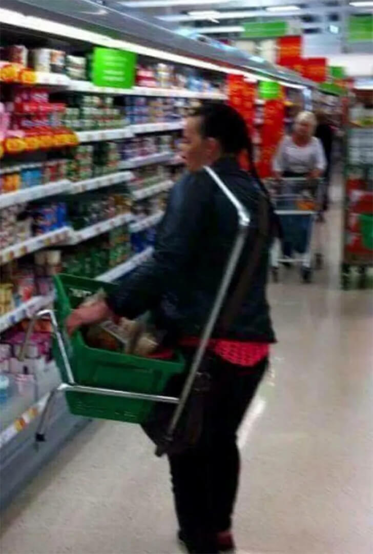 This woman is using a basket at the store in the most harmful possible way. Somehow, she missed both the examples of other people using baskets correctly and the little wheels on the bottom of the basket. As a result, she’s putting way more pressure on her back than she needed to.