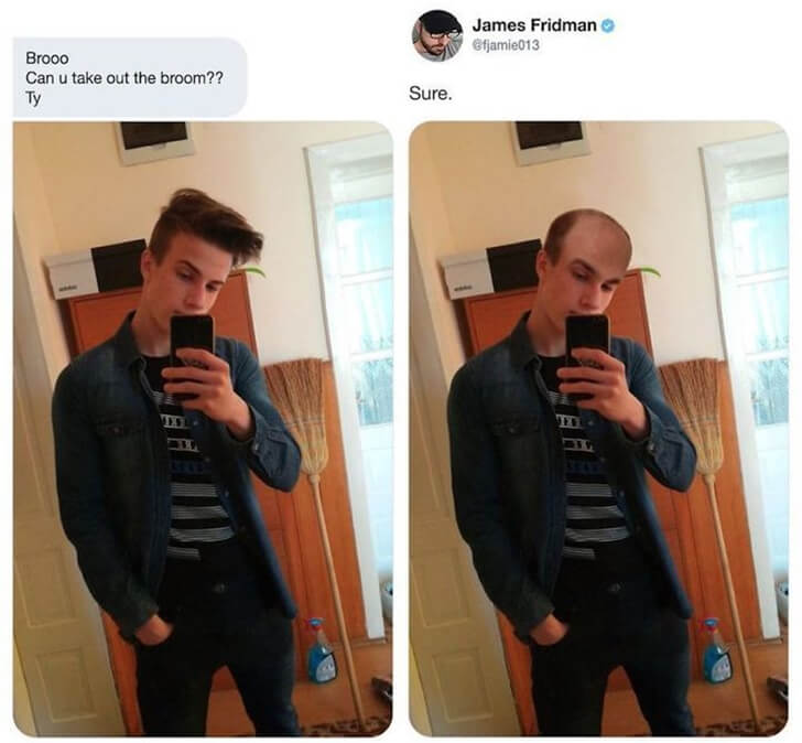 This man was simply trying to make himself appear cooler in his picture by having the sweeper eliminated from the backdrop. Instead, he ended up with something completely different. Not only is the broomstick still in the same place, but also he became bald at an early age.