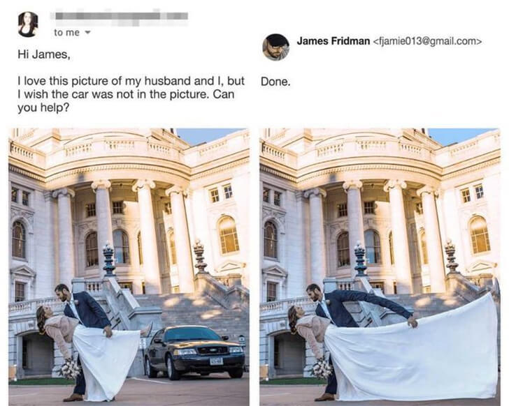 While most women fantasize about having legs that go on for days, we’re willing to guess that the girl had other expectations. At the very least, she has the support of the groom’s arm to keep her legs upright. Those two seem like they belong in a superhero movie.