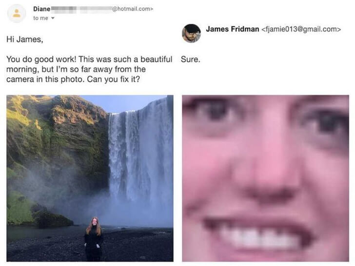 We have no idea what the problem is at this point. If Diane had been standing a little bit closer to the camera, the stunning waterfall that is in the background of the shot wouldn’t have been recorded. Despite this, it seems like a simple crop job that she could have done. Fridman made sure that she was the primary subject of the photograph by concentrating the camera’s lens on her face and excluding the surroundings entirely.