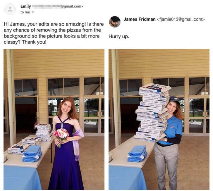 The photo expert went way above what she had done by making the pizza the focal point of the photograph and dressed her up like a Domino’s delivery worker. Now, she just seems like a professional who can take a lot of pieces at once.