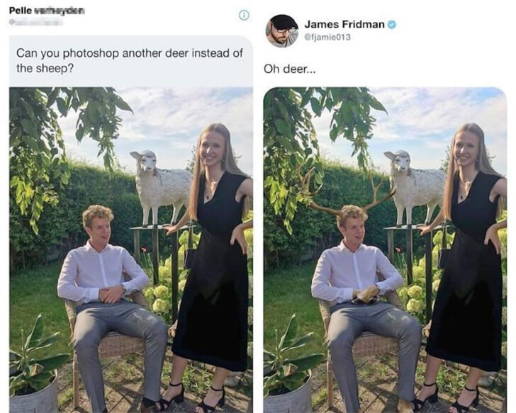 In any case, can we just pause for a second to consider how eerie this decorative sheep is, given that it’s without one ear? The editing whiz delivered them exactly what they requested, but not without putting his unique twist on the peculiar request by giving the young guy antlers and hooves.