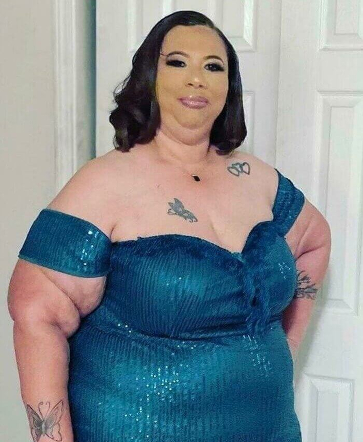Here, we have a stunning plus-size woman rocking a blue sequined dress and flaunting four fabulous tattoos. However, her makeup tells a different story. Her foundation has a yellowish hue that doesn’t match her natural skin tone. The real kicker? It stops abruptly at her chin, leaving a clear, unblended line that screams, “Wrong Makeup Shade!”