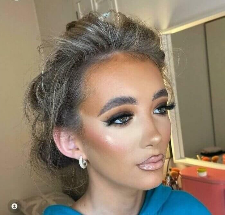 This makeup was almost flawless, but the heavy bronzer and contour on her forehead took it in a different direction. Her hair is pinned back in elegant curls, and her eyes and lips are beautifully done, but the stark white highlight creates an awkward demarcation line between her forehead and the cheek blush. It’s like someone drew a highway on her face, dividing the regions with precision.