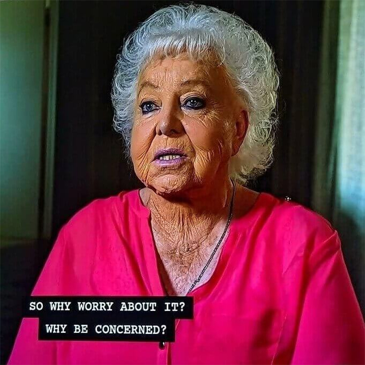 In this interview screenshot, an elderly woman’s makeup is an adventurous mix of orange and brown. While the blending into her neck shows some effort, the clear mismatch with her chest makes it look like a makeup artist ran out of the right shade halfway through.