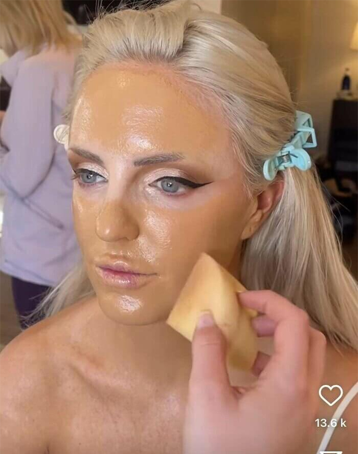 It looks like this bride is getting more than she bargained for with her wedding day makeup. The artist is just getting started, yet her face is already covered in layers of foundation and concealer, giving a whole new meaning to “cakey makeup.”