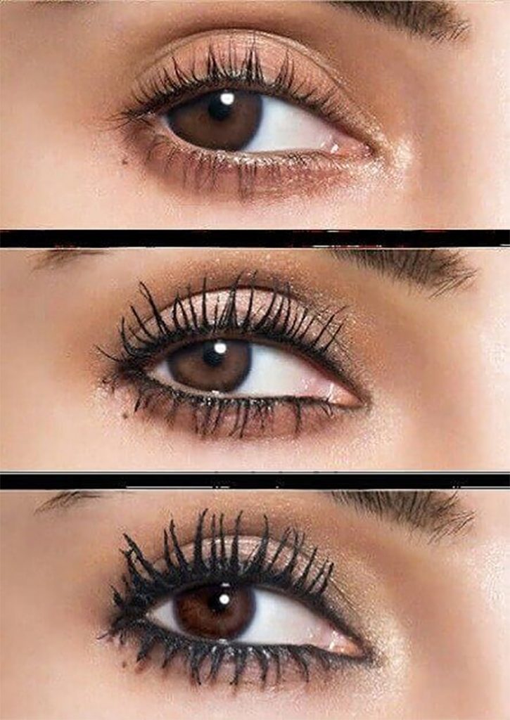 This mascara ad takes an unexpected turn. The first image shows a natural eye, simple and elegant. The second image adds a touch of mascara, enhancing the lashes nicely. But then comes the third image—the so-called ideal look. Instead of lush, voluminous lashes, we get thick, clumpy, cakey chaos.