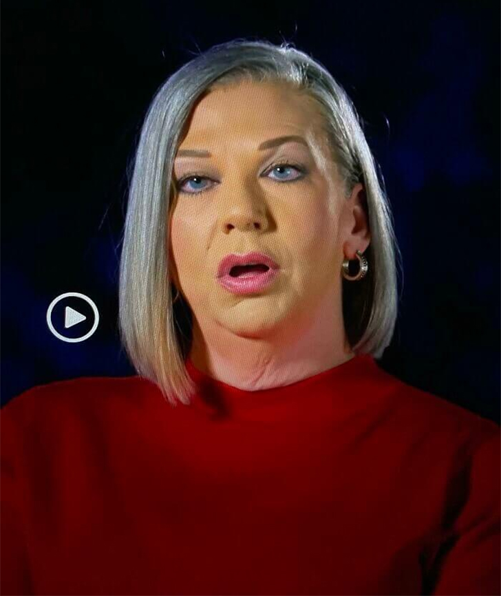 This woman, sporting a red shirt and short white bob, looks ready for her close-up in a true crime documentary—except for her foundation. The makeup artist missed the mark with a foundation that doesn’t match her skin tone, giving her face a pink and yellowish hue that stops at her chin.