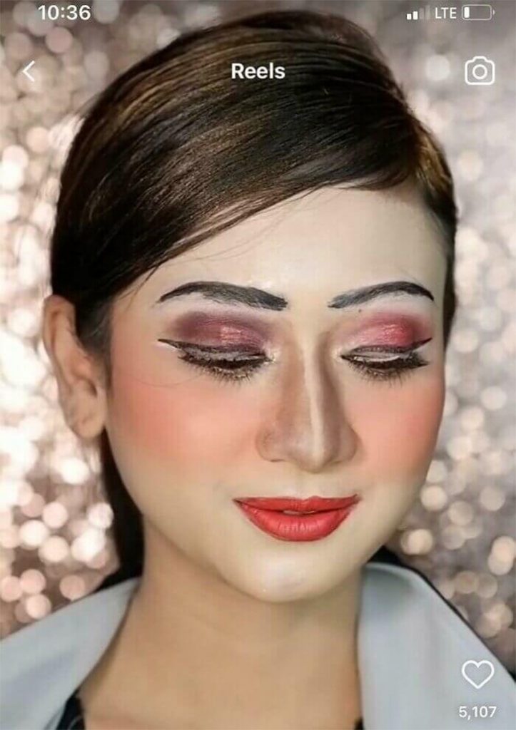This woman seems to be channeling a geisha girl, known for their traditional Japanese makeup featuring pale skin, red lips, and bold eyes. Unfortunately, her attempt missed the mark. Her eyeshadow is unevenly applied, with one eye looking like it had a makeup meltdown.