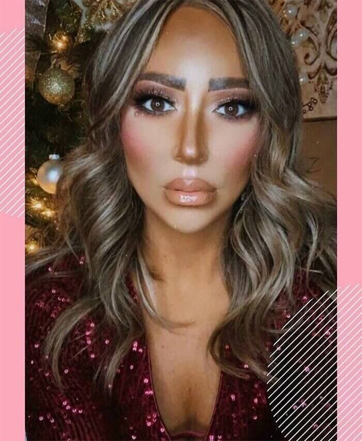 This woman’s holiday glam is turning heads for all the wrong reasons. Decked out in a red sequined gown, lush blonde curls falling to her shoulders, and posing by a festive Christmas tree, her eyebrows look more painted on than natural. The harsh nose contour could carve the holiday turkey.