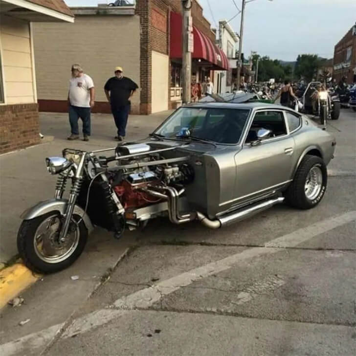 It seems less like a Datsun Motorcycle, but more like a Datsun travesty. The engine, at least, seems much bigger than a 240z, so at least it will have the power to carry the heavy back part of the vehicle!