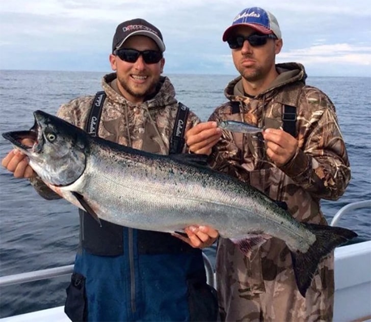 On the high seas, a fishing trip can turn into an unexpected competition. We have two buddies here, one beaming with pride over a shiny salmon, big enough to boast about for seasons to come. The other, behind sunglasses that can’t quite hide his chagrin, holds a fish that’s more of a snack than a feast.