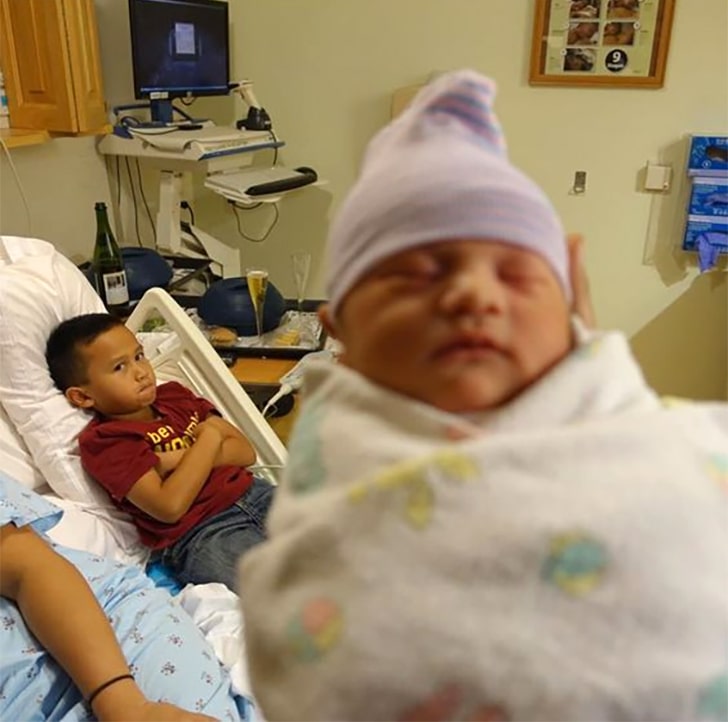 The arrival of a new baby is a whirlwind of emotions, often captured in that first hospital photo. But not everyone might be ready to share the spotlight. Take our little man in the background—arms crossed, pout in place, clearly not amused by the family’s newest addition.