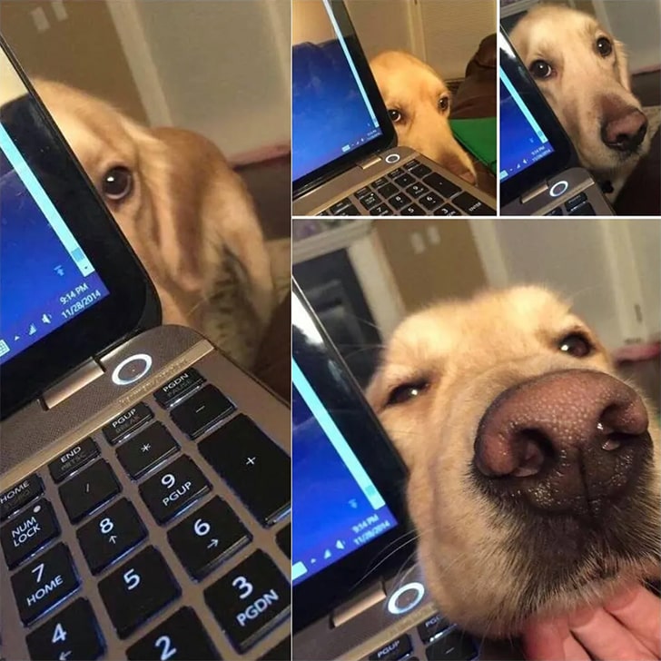 These snapshots show the escalating stages of a dog’s quest for attention. Behind the laptop lies the unspoken battle between tech and tail-waggers. This furry friend peeks, pouts, and finally plants a snoot firmly against the screen, a silent but adorable protest against the digital world that often captivates their humans.