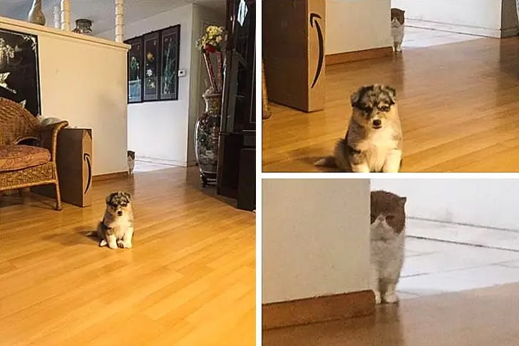 In the quiet corners of a home, the age-old tale of feline vs. canine unfolds with silent drama. In this snapshot, the family cat, melding with the wall in an expert display of camouflage, casts a surreptitious glance at the oblivious new pup. In innocent ignorance, the dog has no clue of the stealthy surveillance.