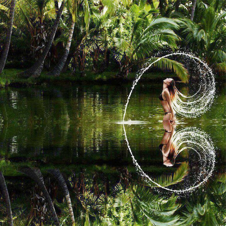 Cette photo est tout simplement parfaite, la pose de la jeune femme ainsi que les talents du photographe. Tout est présent pour faire un sublime cliché. Et bien sûr, que dire de l’emplacement choisi ! Un magnifique paysage paisible avec de grands palmiers derrière. L’effet miroir est incroyable !