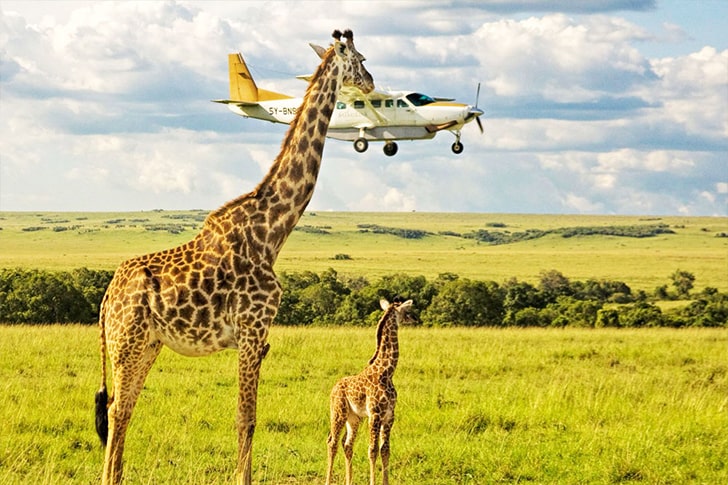 Ci-dessus, nous pouvons voir ces animaux fascinants dans leur habitat naturel, aux côtés d’un avion qui vole bas dans le ciel. Il montre le contraste entre l’homme et la nature sauvage, avec la maman girafe à côté de son bébé girafon regardant l’avion. On pourrait même croire que la mère veut atteindre l’avion avec sa gueule !