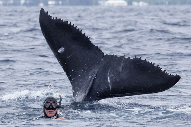 C’est ce qui se passe sur ce cliché. La curiosité de cette baleine a eu raison d’elle et c’est certainement la raison pour laquelle elle s’est approchée de ce nageur. La photo a été prise au bon moment, car le nageur sort la tête de l’eau alors que la queue de la baleine est hors de l’eau. Les deux situations donnent l’illusion de voir une sirène.