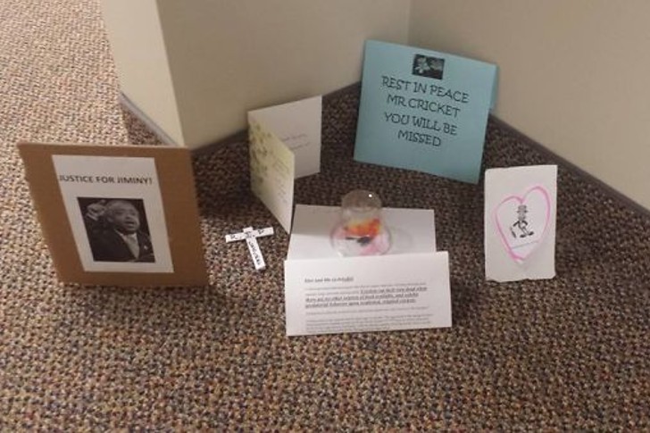 We hope the cleaning staff will soon take measures to remove the dead body. It is so sad that many crickets lose their life due to the noise they make, just like Jiminy Cricket from “The Adventures of Pinocchio.” In the original story, Pinocchio killed Jiminy with a mallet for his babbling.