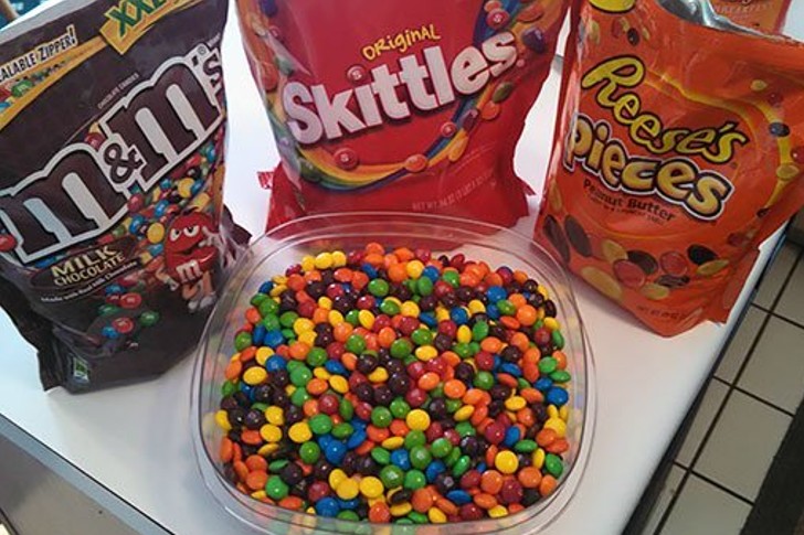 The bowl seems so colorful to attract anyone to eat it. The only solution to empty the container is to have three people with different choices so they can pick their preferences. It also seems to be a test for the color blind as they cannot distinguish between red, green, and blue.
